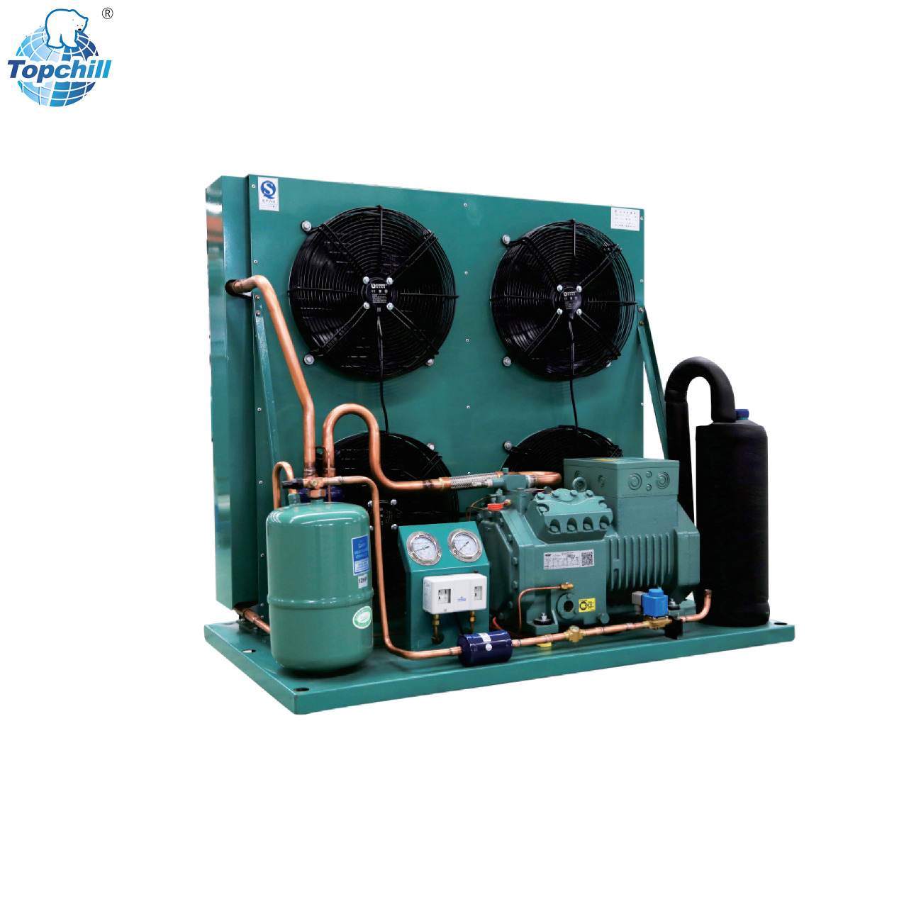 The Topchill Semi-Hermetic Air-Cooled Condensing Unit is a rugged, multi-purpose cooling solution featuring semi-hermetic compressors and efficient W-shaped internally threaded coils. Compatible with R22, R134A, and R404A refrigerants, it excels in commercial refrigeration, small industrial processes, and space-constrained areas—thanks to its compact design and reliable protection systems.